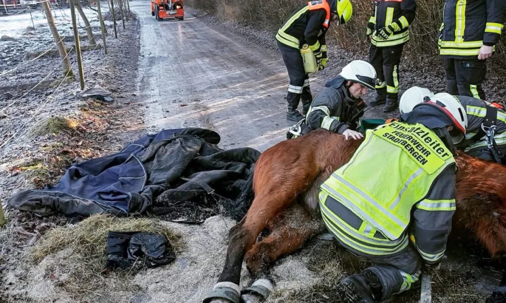 Technischer Hilfeleistungseinsatz: Rettung eines gestürzten Pferdes auf eisglattem Untergrund Zu einem besonderen Hilfeleistungseinsatz wurden mehrere Feuerwehren und unterstützende Stellen alarmiert, nachdem ein Pferd auf einem vereisten...