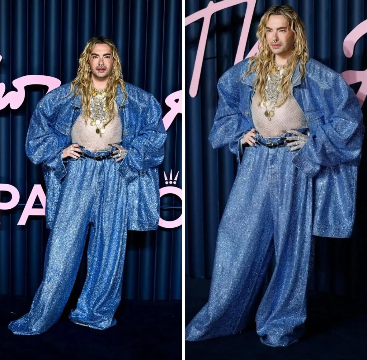 Unter der Jacke trug er ein transparentes, leicht schimmerndes Oberteil, das einen überraschenden Kontrast zum opulenten Stoff der äußeren Schichten bot. Dadurch entstand ein Spiel zwischen Stärke und Verletzlichkeit, zwischen Aufbau und Offenheit – eine visuelle Metapher, die perfekt zu Kaulitz’ künstlerischer Persönlichkeit passt. Ergänzt wurde der Look durch auffällige, vielschichtige Goldketten und Ringe, die seine Hände zu funkelnden Akzenten machten. Sein langes blondes Haar trug er in sanften Wellen, ein Stil, der in Kombination mit dem glitzernden Blau eine ätherische, fast ikonische Gesamtwirkung ergab.