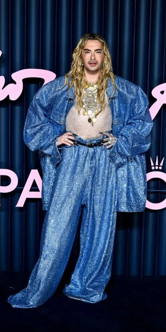 Schon beim Betreten des Eventraums wurde klar, dass dieser Abend nicht nur von Glamour begleitet werden würde, sondern ihn regelrecht neu definieren sollte. Kaulitz erschien in einer voluminösen, himmelblauen Glitzerhose, deren funkelnde Oberfläche das Licht der Scheinwerfer wie flüssiges Metall reflektierte. Dazu kombiniert trug er eine übergroße Jacke aus dem gleichen Material, deren Silhouette in bewusst dramatischen Proportionen gehalten war. Die Kleidung schien weniger einem gewöhnlichen Outfit zu gleichen, sondern vielmehr einem kunstvollen Bühnenkostüm – ein kraftvolles Statement, das jede Bewegung in einen Moment verwandelte.