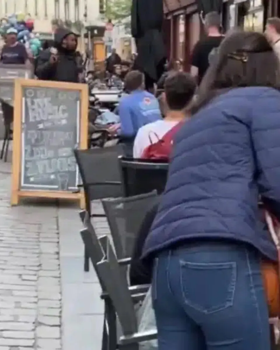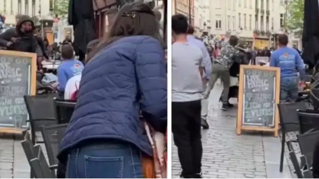 Auf den Aufnahmen ist zu sehen, wie mehrere Menschen an kleinen Tischen auf einer Café-Terrasse sitzen. Es herrscht offenbar normaler Tagesbetrieb, Passanten laufen vorbei, Stühle stehen dicht beieinander auf dem Kopfsteinpflaster. Inmitten dieser alltäglichen Szene entwickelt sich ein Streit zwischen einem Mann und einigen Terrassengästen.