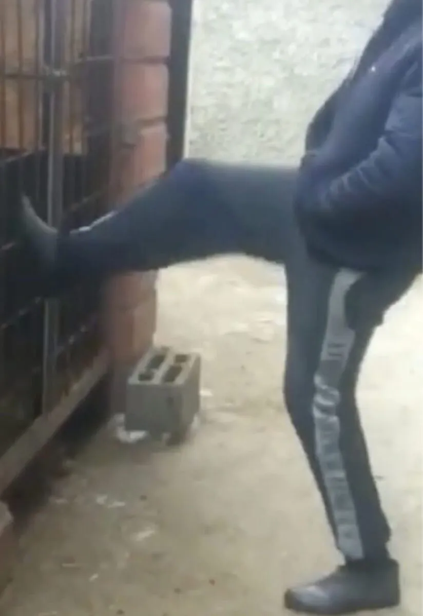 Im Mittelpunkt des Geschehens steht ein Hund. Ein Tier, das weder provoziert noch angegriffen hat. Ein Lebewesen, das sich hinter einem Zaun befindet, offenbar in einem abgegrenzten Bereich, möglicherweise einem privaten Grundstück oder einer Art Zwinger. Der Mann nähert sich, zunächst zögerlich, dann gezielt. Er hebt sein Bein, tritt durch das Gitter, wieder und wieder. Kein Versehen, kein Moment der Unachtsamkeit – sondern eine bewusste Handlung. Der Hund kann nicht ausweichen. Er kann nicht fliehen. Er kann sich nur auf das verlassen, was ihm die Natur gegeben hat: seinen Instinkt.